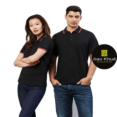Áo màu đen phối viền cổ và viền bo tay sọc đỏ sang trọng, chuyên nghiệp cho doanh nghiệp, công ty.